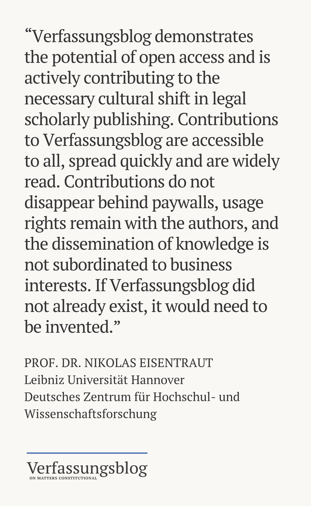 Beyond our daily work, we are also committed to making open access the norm in legal publishing — ensuring that constitutional law expertise remains available to everyone. Our recent exclusion from the Directory of Open Access Journals (DOAJ) has sparked an important debate about how quality assurance and publication formats should be understood in open access publishing, so that innovative formats at the intersection of academia and public discourse are not disadvantaged. We remain steadfast in our mission. We are developing independent projects to strengthen the foundations of open access, promoting international and interdisciplinary discussion on standards, funding models, and dissemination in libraries and databases. Your donation helps us modernize academic publishing — and ensure that open access remains open.