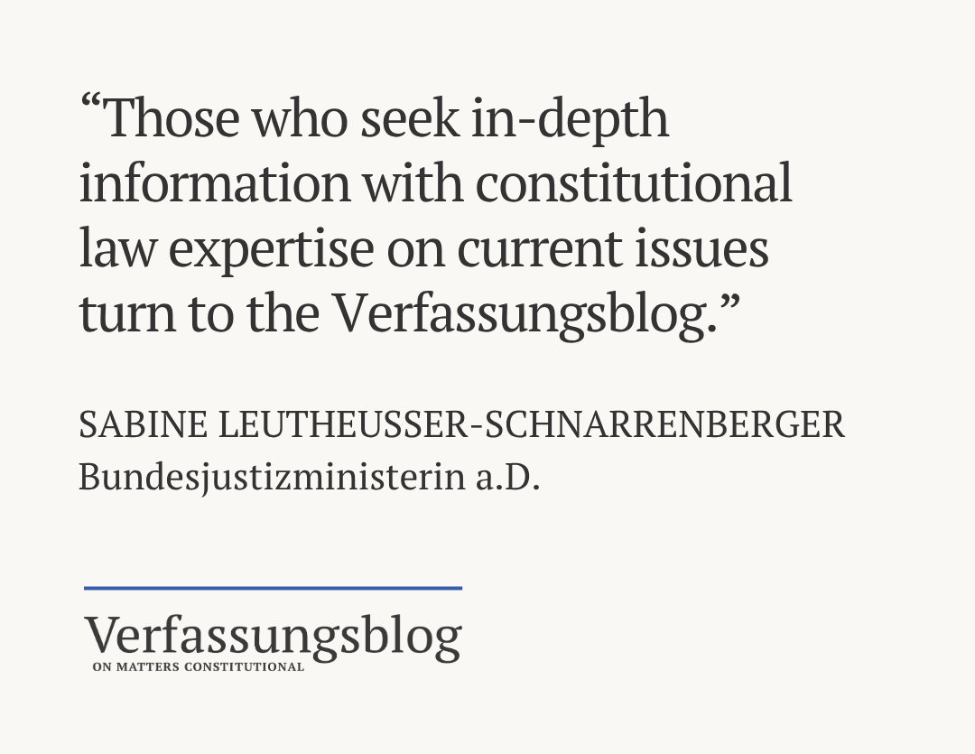 Verfassungsblog is actively committed to defending democracy and the rule of law. We began in Thuringia, are now examining the judiciary across Germany, and in 2026 will turn to the media and academia. Our research and reporting investigate how authoritarian populists attack the free democratic constitutional order — and we publish it all open access. Our work is already shaping democratic practice: in Saarland, there are concrete plans to draw on the findings of our Thuringia Project to strengthen the state constitutional court against strategic blockades and other populist attacks. Similar reform efforts are emerging in other federal states. Following the 2024 amendment to the Basic Law on the Federal Constitutional Court, these could be the next constitutional changes in Germany informed by Verfassungsblog’s research. Your donation helps make democracy more resilient.