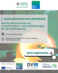 Einladung zur zweitägigen Fachkonferenz „Von der Montanunion zur Transformation – Herausforderungen für die Stahlindustrie“ am 25. und 26. Februar 2026 im Ministerium für Wirtschaft, Innovation, Digitales und Energie des Saarlandes in Saarbrücken. Die Konferenz bringt Expertinnen und Experten aus Wissenschaft, Politik und Industrie zusammen, um zentrale Zukunftsfragen der europäischen Stahlindustrie zu diskutieren, unter anderem zu geopolitischen Rohstoff- und Energiemärkten, Energiepreisen und Wettbewerbsfähigkeit, Wasserstoff und grüne Transformation, Handels- und Industriepolitik einschließlich CBAM sowie regulatorische Entwicklungen auf europäischer Ebene.